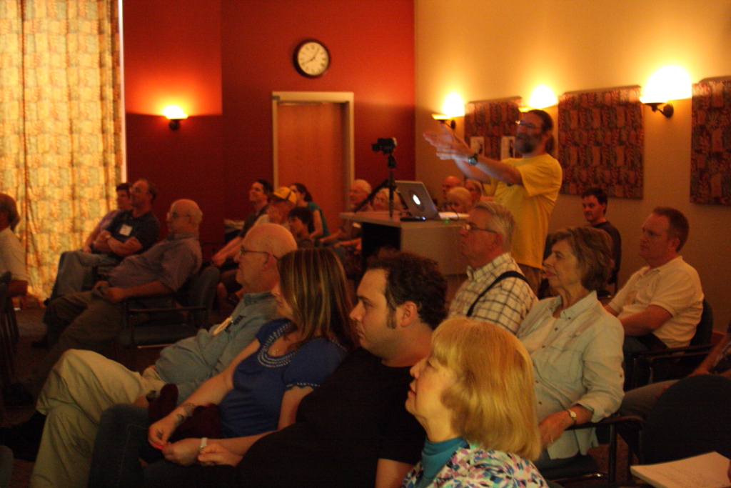 The warm up was about his travels to the western United States to view the eclipse that happened earlier this year.  He and his traveling companion found the line of the eclipse in Texas and watched it from there.  He had pictures of this and pictures of other places on his trip, including Roswell, White Sands and the very large array.