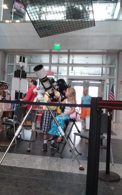 On Thursday night, July 24, RAC participated in the NC Museum of Natural Sciences Title 1 School Night program. Over a hundred guests interacted with our exhibits in the NRC lobby. Club members set up binocular and telescope stations along with hi-res images of the moon that visitors enjoyed viewing. Frank W, Doug L and Daniel K answered lots of questions and kids enjoyed getting glow sticks for viewing the moon.