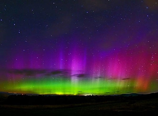 Fortunately for us, this storm has just produced a class G1 geomagnetic storm that may grow to G3 as the last waves of the CME hit us this weekend. While this is not enough of a storm to produce serious problems for communications and power systems, it is enough to jack up the nighttime Aurora Borealis displays visible in northern latitudes. A photo, taken from Maine, of the Aurora produced by this storm is shown below.
