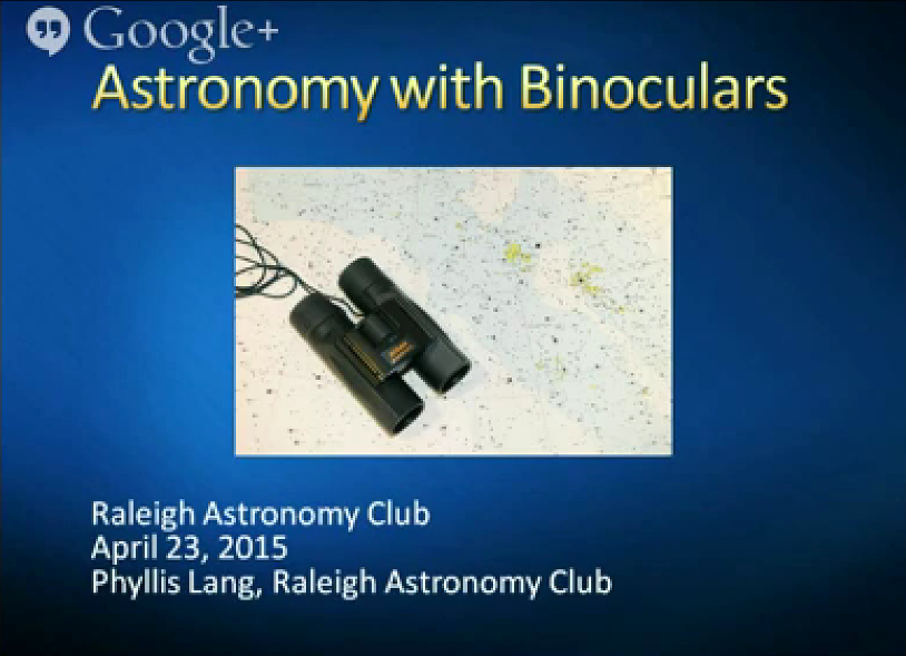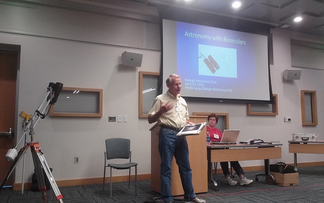 For our April meeting, long time RAC member Phyllis Lang gave an excellent talk on Binocular Astronomy. Phyllis described the different types of binoculars available for astronomy use, how to get the most out of them and what objects look best in binoculars. Many people assume that the best astronomy observing is done with the biggest telescopes. But many objects – the moon, large open clusters and large nebula look as good or better through binoculars. Binoculars offer a wider field of view than telescopes and can provide a much better showcase for large objects or rich starfield patches of night sky.