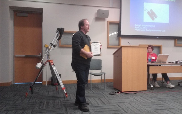 In the business portion of the meeting, club officers discussed RAC support for the Morehead Planetarium’s Statewide Star Party events and upcoming officer elections. Doug Lively, the club’s Astronomical League Coordinator; handed out the following AL observing awards: