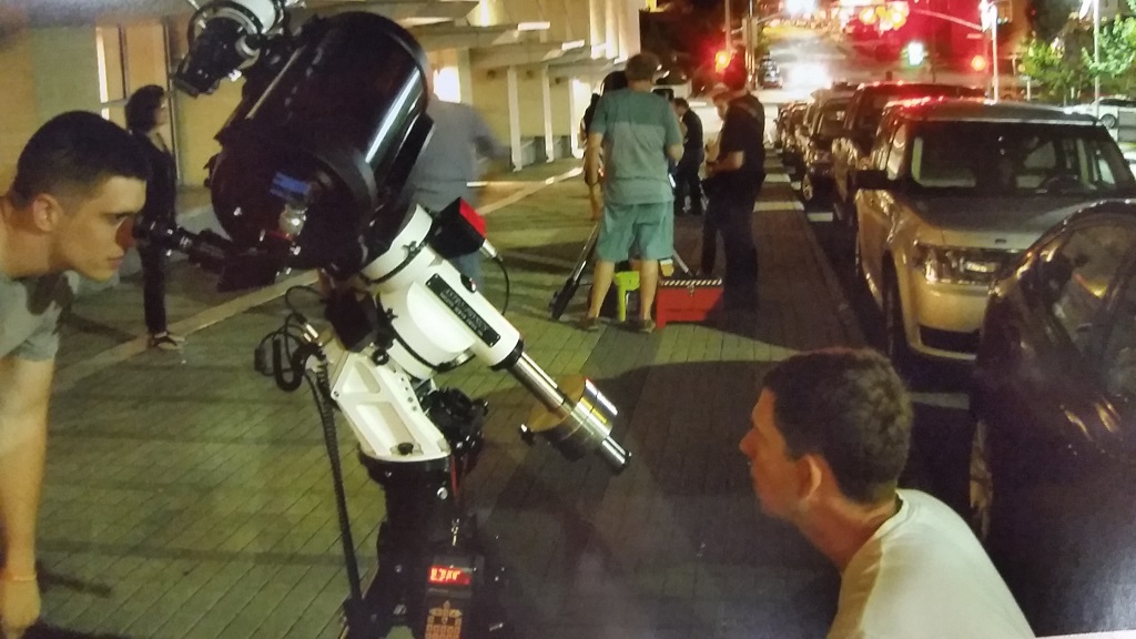 On June 10-12, 2015 Raleigh hosted the 43rd AMS Broadcast Meterology conference. Broadcasters from all over the country converged on the Civic Center for presentations and meetings. They also were treated to a sidewalk observation session from the Raleigh Astronomy Club. On Thursday, June 11, several members came out and set up on the sidewalk to provide views of celestial objects. Despite the city lights and storms in North Raleigh and Cary, the skies downtown were clear and seeing very, very steady. Venus, Jupiter, and Saturn provided some really great views not only to folks leaving the conference, but for many which came dowtown for the free concert on Fayetteville street. Thanks again to all the members who participated in this event.