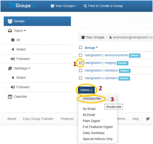 Then, select the groups you wish to unsubscribe from, and click “actions” and “unsubscribe”